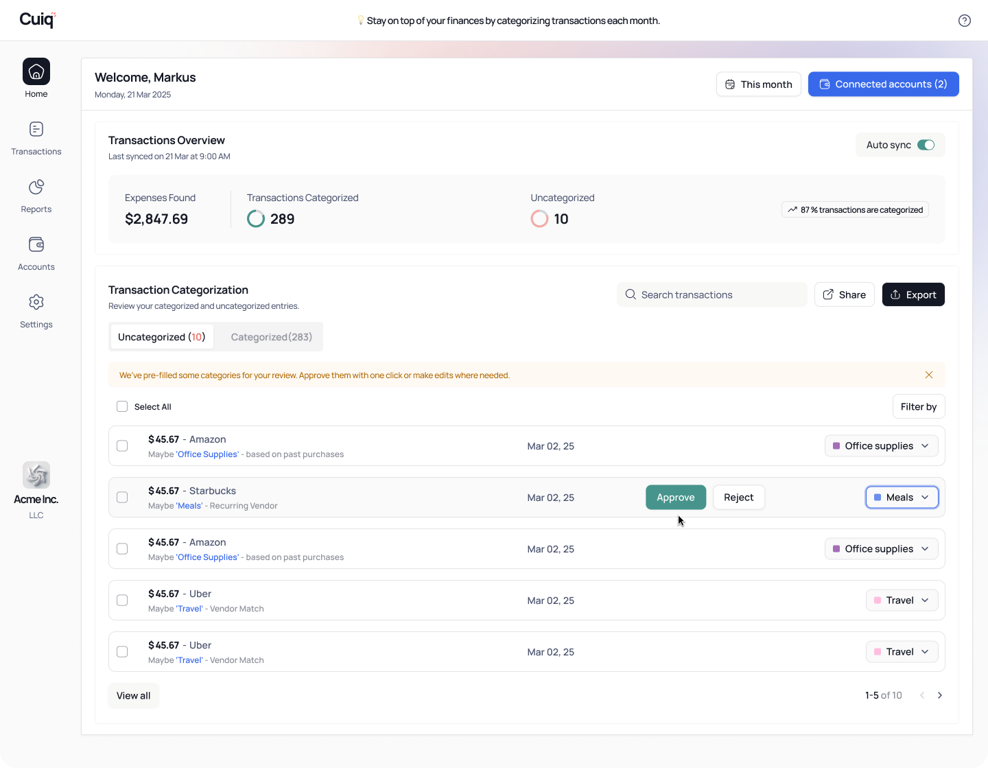 Review and approve categories with one click. The more you use it, the better Cuiq gets at understanding your business.