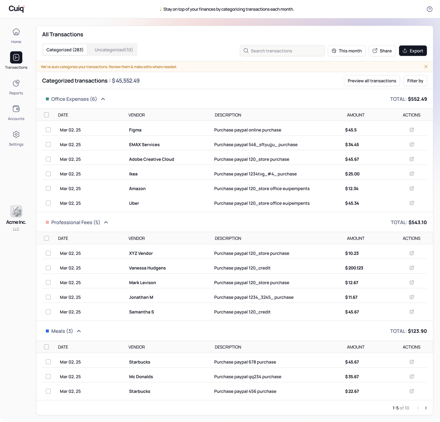 Cuiq automatically categorizes your business transactions, so you can file taxes, seek capital or unlock new opportunities.